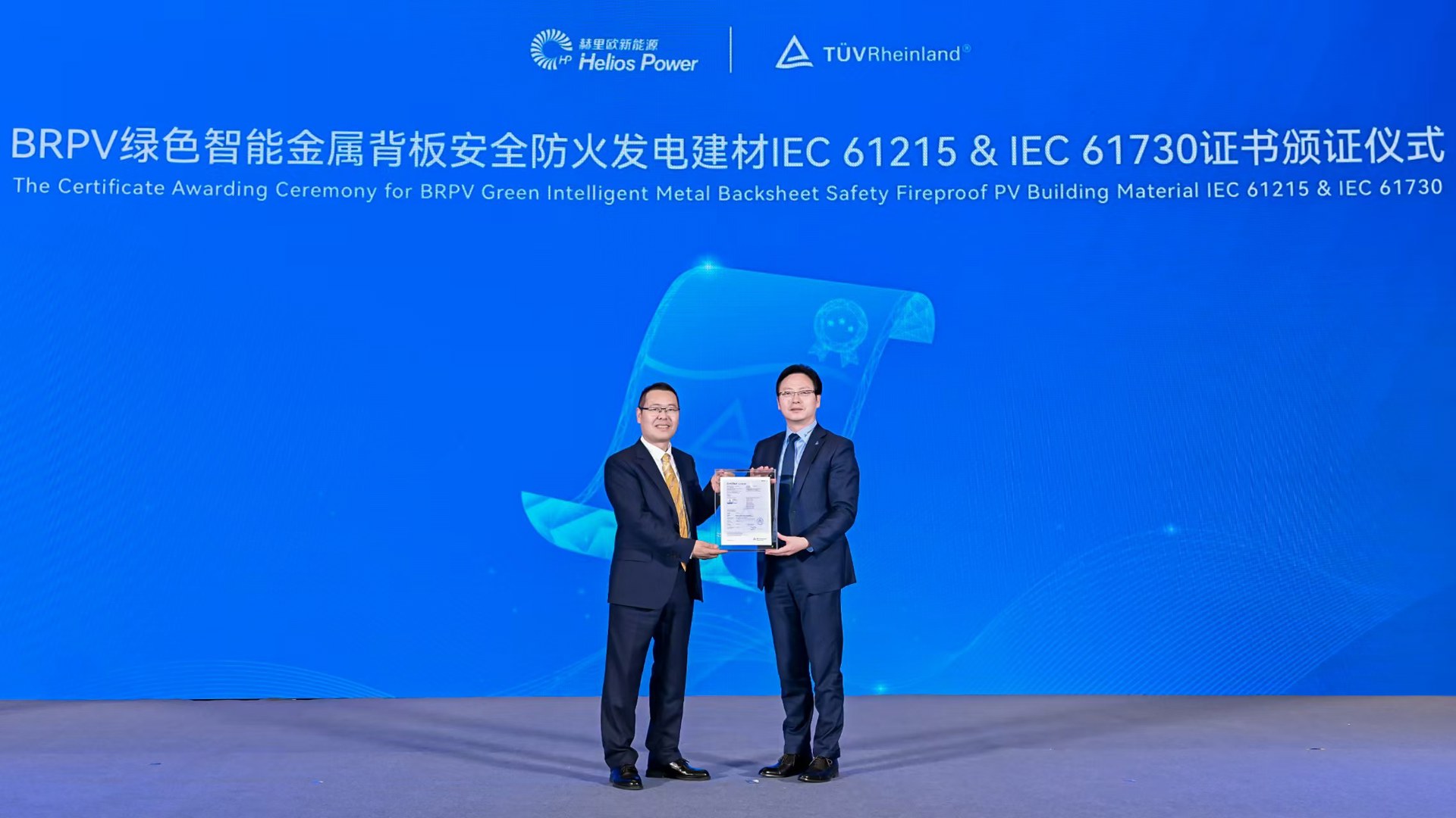 “颁证仪式”环节,赫里欧总经理崔永祥代表公司正式接受由德国莱茵TÜV大中华区总裁李卫春先生颁发的两项国际权威认证证书《BRPV绿色智能金属背板安全防火发电建材IEC61215 & IEC61730证书》。
