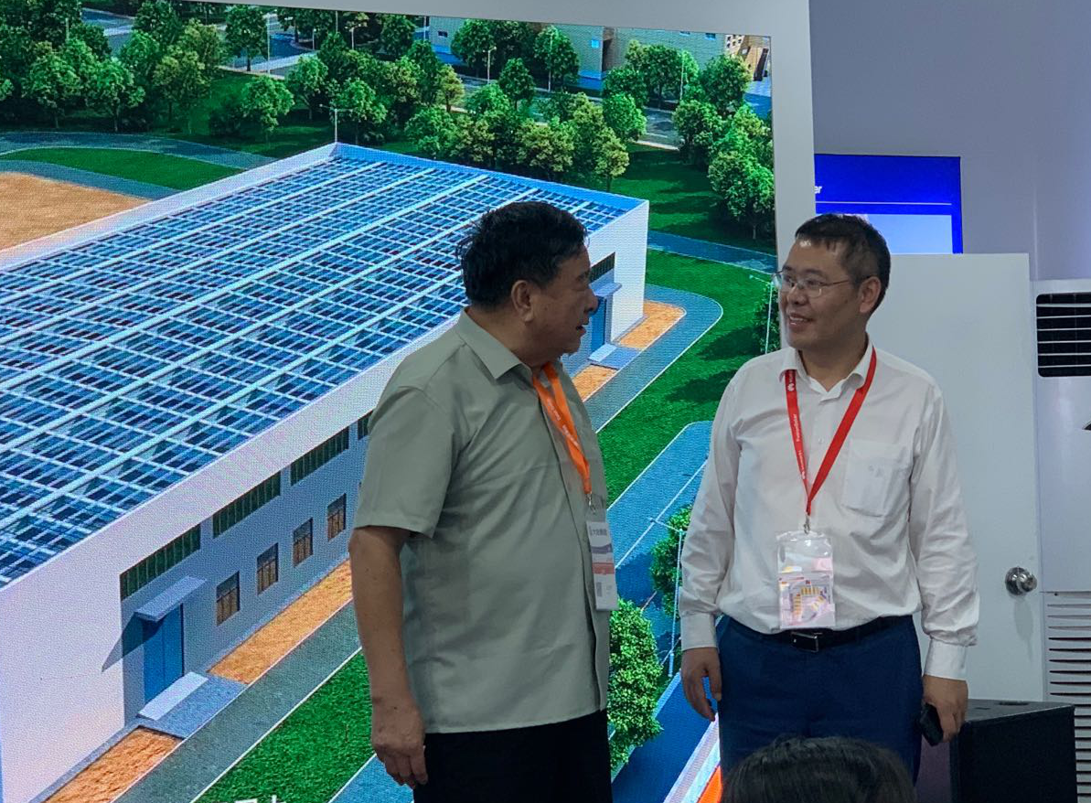 赫里欧CTO崔永祥向中科院院士周孝信介绍BIPV屋面发电系统