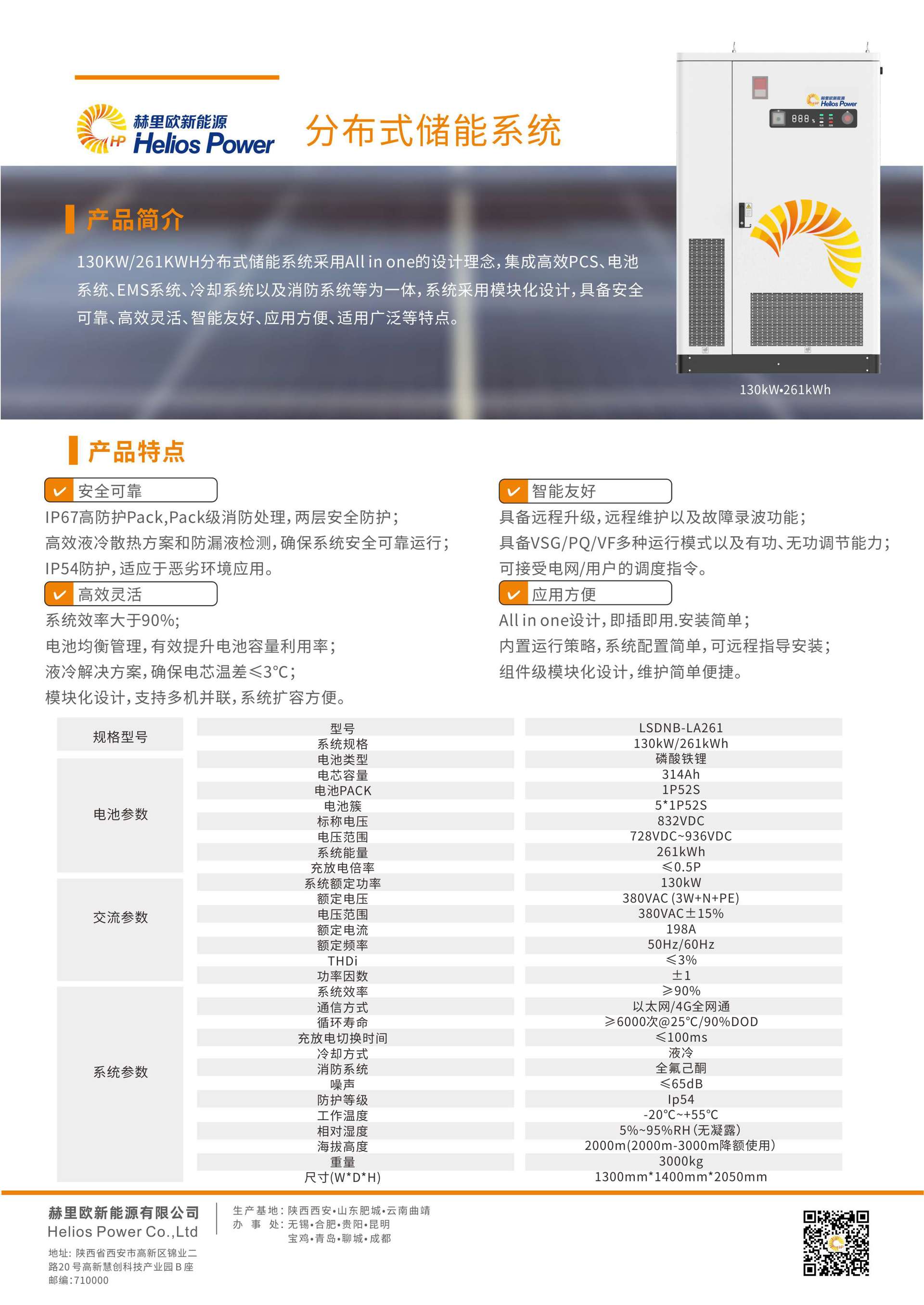 130KW/261KWH分布式储能系统采用Allinone的设计理念,集成高效PCS、电池系统、EMS系统、冷却系统以及消防系统等为一体,系统采用模块化设计,具备安全可靠、高效灵活、智能友好、应用方便、适用广泛等特点。