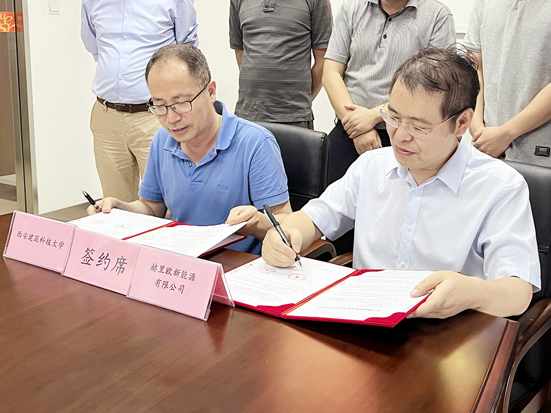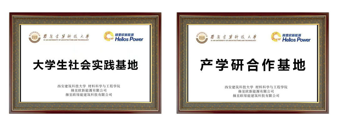 2022年7月13日,西安建筑科技大学与赫里欧新能源有限公司在赫里欧总部签订了大学生社会实践基地合作协议并授牌,西安建筑科技大学材料科学与工程学院党委书记段锋、副书记崔捷、功能材料研究所所长尹洪峰、副所长云斯宁及功能材料研究所张强博士等相关代表;赫里欧新能源有限公司总经理崔永祥、总经理助理马水莹等代表参与了本次会议。