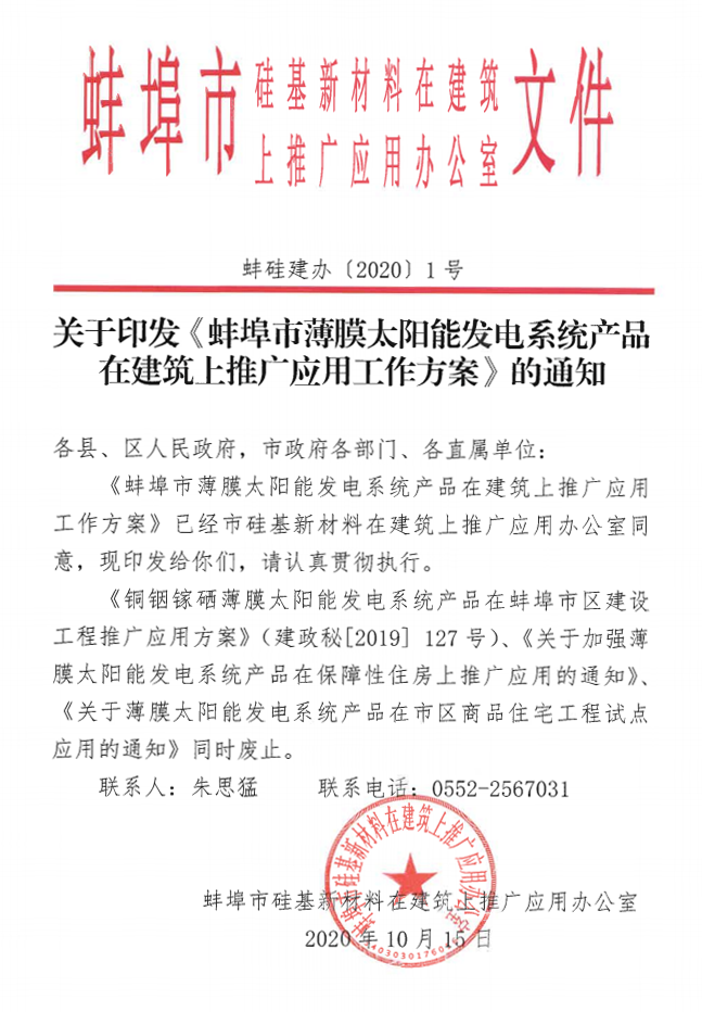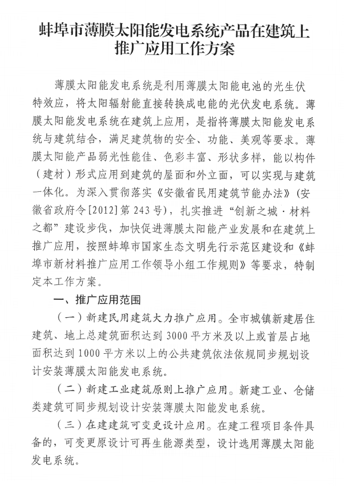 地方政府发文推行BIPV!蚌埠薄膜太阳能系统在建筑上推广应用方案出炉! 发布日期:2020-11-02