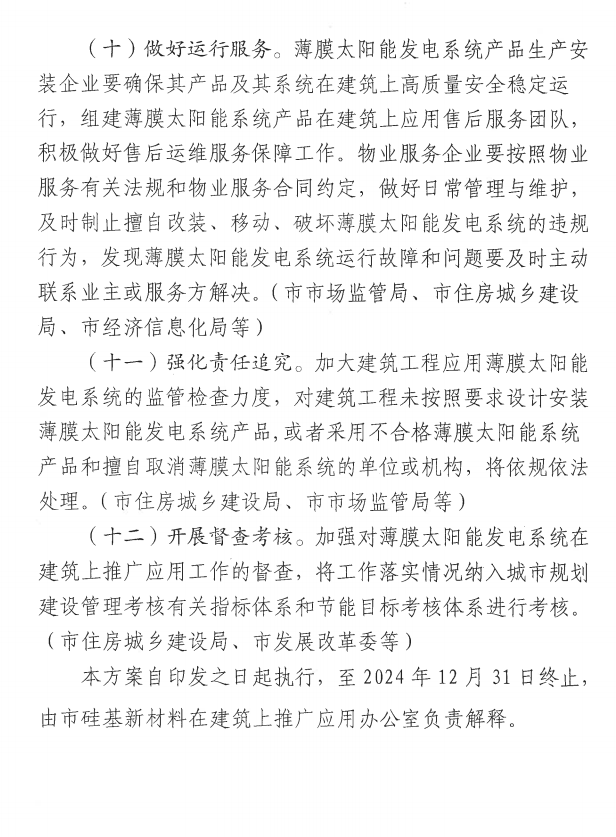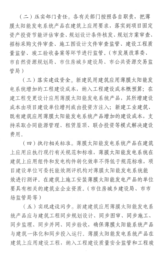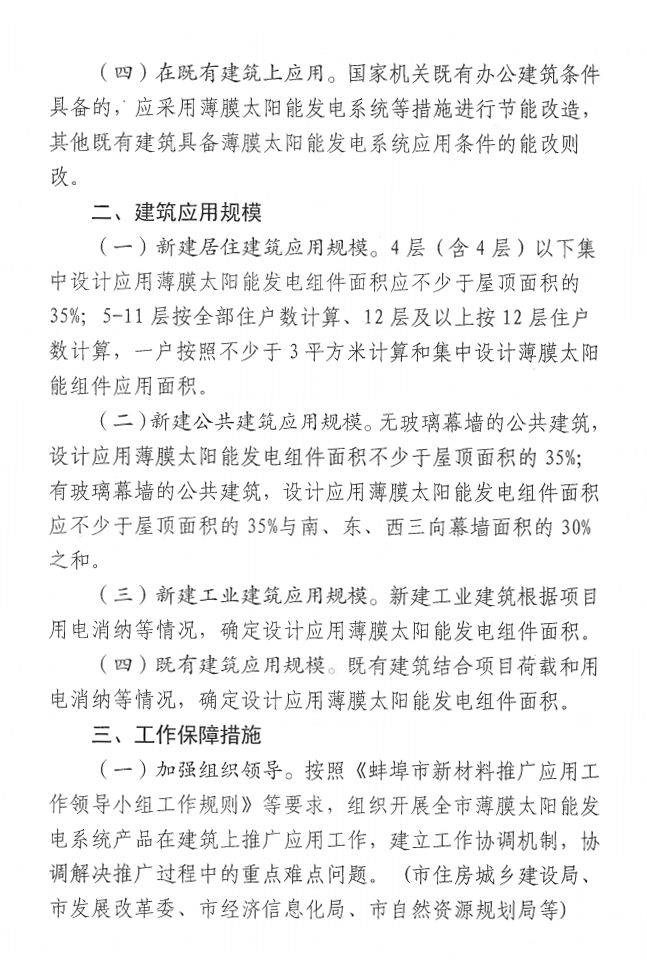 全市城镇新建居住建筑、地上总建筑面积达到3000平方米及以上或首层占地面积达到1000平方米以上的公共建筑依法依规同步规划设计安装薄膜太阳能发电系统。