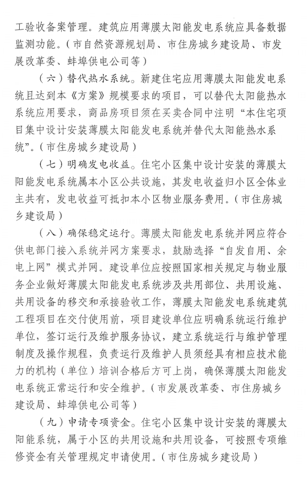 【国际能源网 讯】10月29日,安徽省蚌埠市住房城乡建设局(市行政执法局)发布《蚌埠市薄膜太阳能发电系统产品在建筑上推广应用工作方案》(以下简称《方案》),同时废止《铜铟镓硒薄膜太阳能发电系统产品在蚌埠市区建设工程推广应用方案》(建政秘[2019]127号)、《关于加强薄膜太阳能发电系统产品在保障性住房上推广应用的通知》、《关于薄膜太阳能发电系统产品在市区商品住宅工程试点应用的通知》。