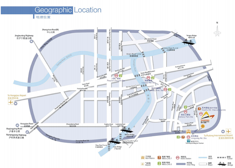 上海新国际博览中心(SNIEC)坐落于上海浦东开发区,比邻世纪公园。SNIEC 东距浦东国际机场 35 公里,西距虹桥国际机场 32 公里。