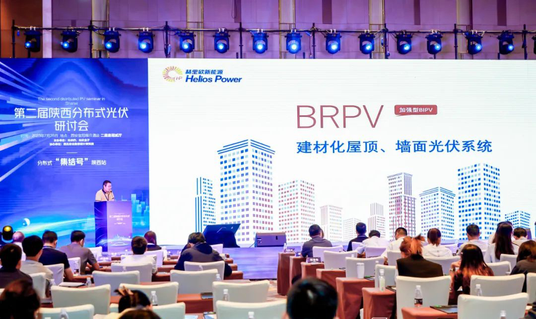 赫里欧新能源董事长崔永祥在第二届陕西分布式研讨会上发表了题为“赫里欧建材化BRPV屋顶、墙面光伏系统”的主题演讲。介绍了赫里欧发电建材以及赫里欧建筑发电系统在分布式光伏领域相比传统光伏的优势和技术创新。赫里欧新能源从2017年开始BIPV产品研发,经过多年快速发展,拥有专业化制造基地,成为新型智能发电建材领域的国家高新技术企业。