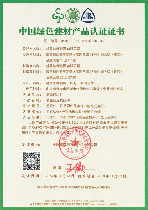 2023年11月3日,赫里欧新能源有限公司“赫里欧单晶硅光伏组件”通过中国建筑科学研究院有限公司的审核,成功获颁中国绿色建材产品认证三星级证书,加入中国绿色建材产品认证!
