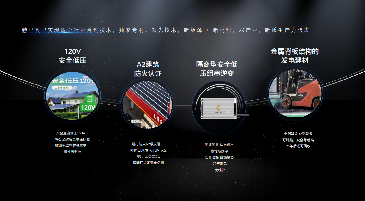 在新材料产业供需对接会上,赫里欧作为西安代表企业,发表《建筑光伏的路线选择:安全低压与建材化》的学术交流,从技术、标准与案例三个维度,强调赫里欧四个行业首创技术。