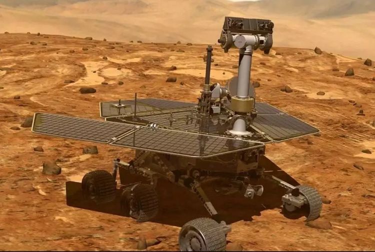 勇气号于2003年6月10日发射后,机遇号于2003年7月7日,出发历经200多天,2004年1月25日机遇号降落在火星表面(勇气号拍摄)
