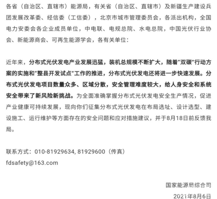 但关于屋顶光伏着火的事故和新闻却频频发生。国家能源局在2021年6月20日启动整县开发政策引导后,迅速在8月12日发出《国家能源局综合司关于征询分布式光伏发电安全生产问题和建议意见的函》。