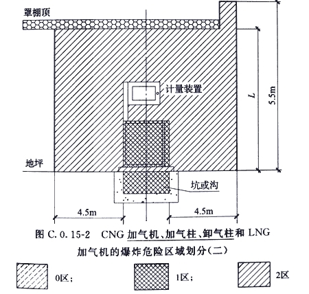 C.0.15 CNG加气机、加气柱、卸气柱和LNG加气机的爆炸危险区域的等级和范围划分,应符合下列规定: